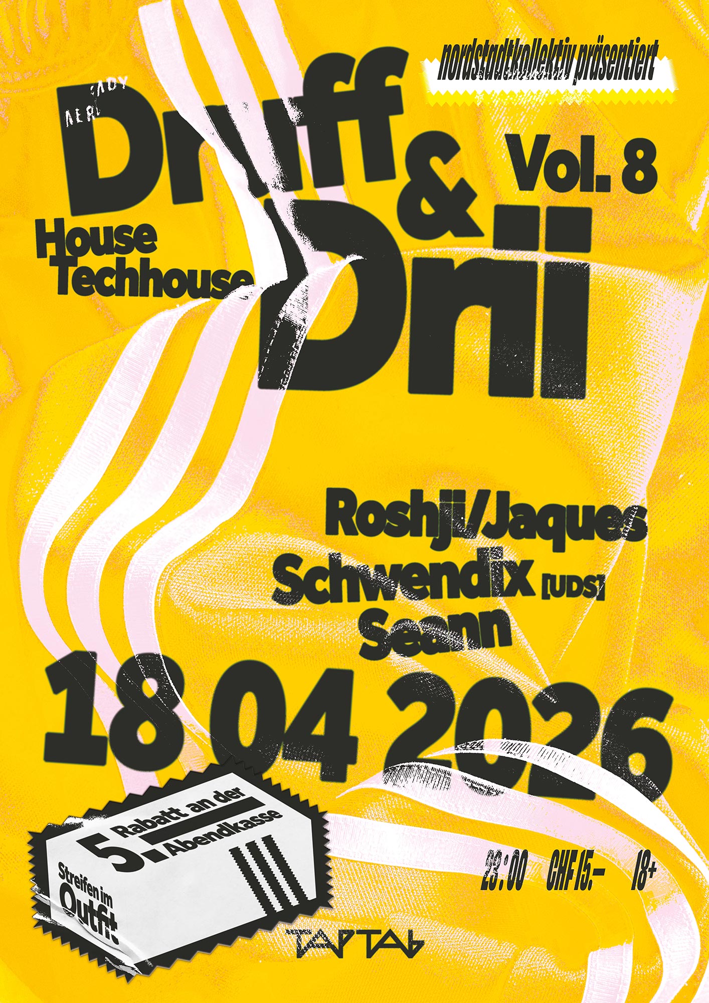 Ihr dürft euch wie immer über die Residents SEANN und ROSHJI/JAQUES sowie einen Special Guest freuen. Kein Geringerer als SCHWENDIX vom UDS-Kollektiv steht für euch an den Decks und sorgt für die nötige Kondition. Freut euch auf eine steppige, schwitzige, szenige Tanznacht. Wir wissen, was Trainerhosen mit Techno zu tun haben – also ab in die Hose und losgetanzt!