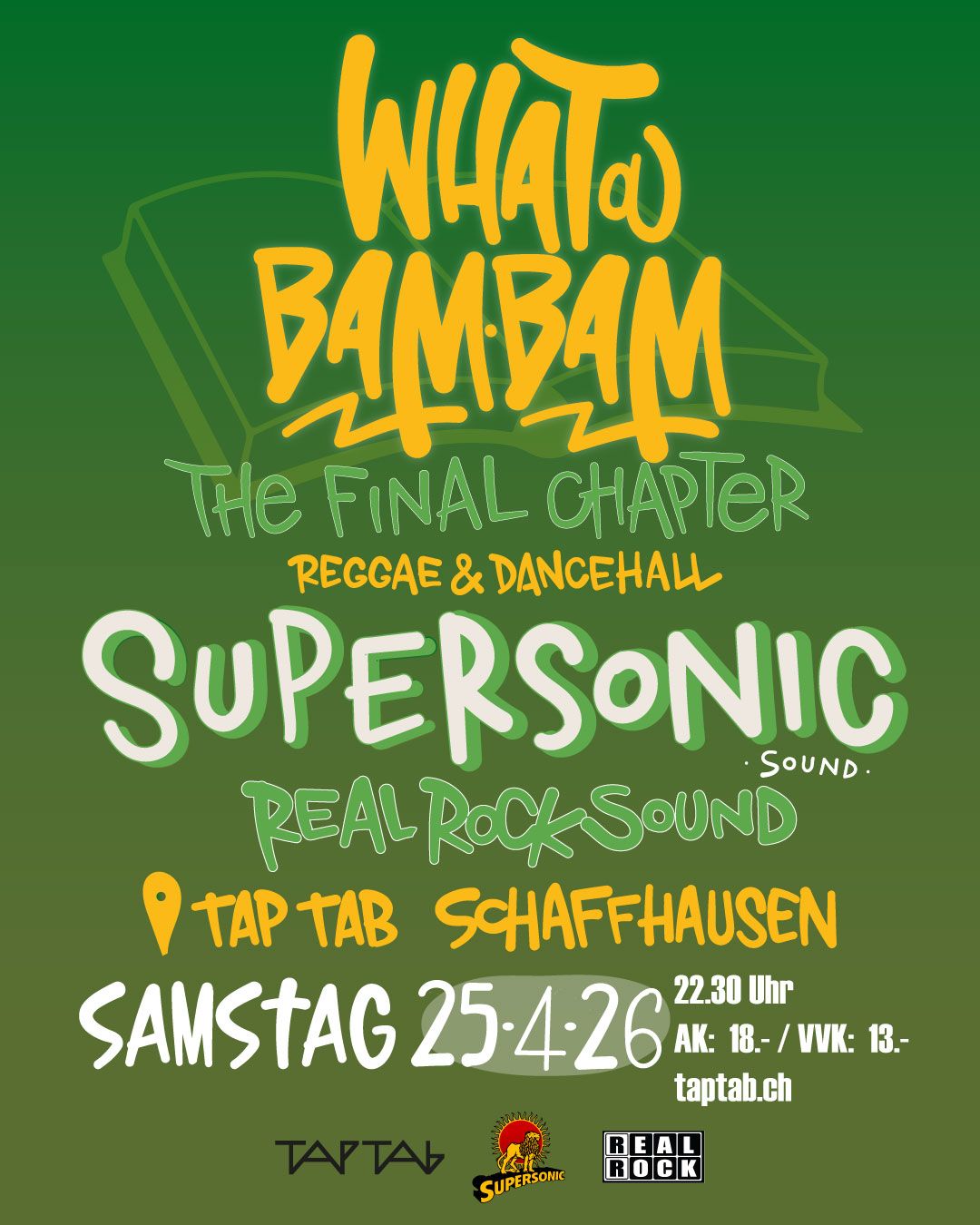 Unsere hauseigene Reggae- und Dancehall-Reihe, die WHAT A BAM BAM, ruft zum letzten Tanz. Nach über zwanzig Jahren beenden die Gastgeber von REAL ROCK SOUND dieses Kapitel und gönnen sich und euch dazu nochmals einen grossen Gast: SUPERSONIC SOUND aus Berlin! Selecta Panza und MC Spider von Supersonic beehren uns nach langer Abwesenheit mal wieder, im Gepäck haben sie eine tanzbare Mischung aus Reggae und Dancehall, nicht fehlen dürfen dabei auch ihre exklusiven Dubplates. Aktiv seit 1998, sind Supersonic Sound eine feste Grösse im internationalen Club- und Soundclash-Circuit und ausserdem auch bekannt für ihre eigenen Produktionen, Mixes und Panzas Sendungen bei “Nice Up Radio”.