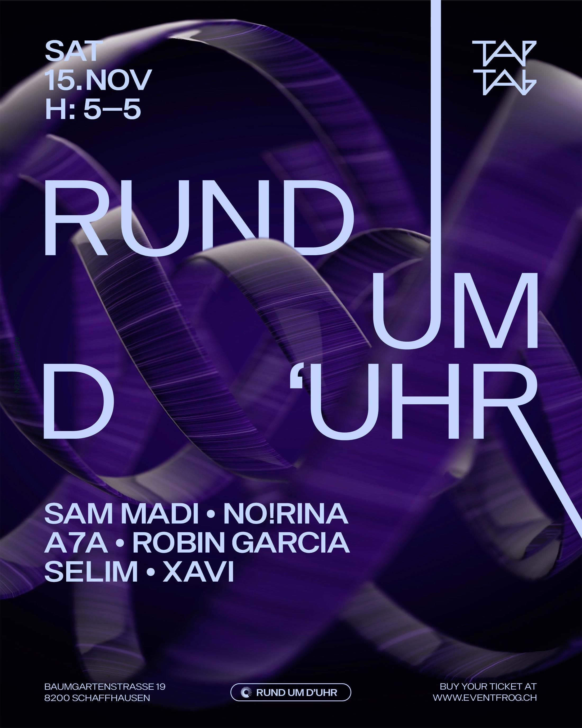Es geht wieder rund in Schaffhausen – im Kreis der Nacht. Auch in der neuen Tap-Tab-Saison darf dieser House- und Techno-Event nicht fehlen. Rund um d'Uhr ist ein schier endloser Rave für alle, die nicht bis Mitternacht warten wollen, um loszutanzen. Bevor am Samstag, dem 15. November 2025, der Vorhang zum Mainfloor fällt, beginnt der zwölfstündige Rave um 17 Uhr auf der Estrade. Wenn diese voll ist, verlagert sich das Tanzen auf die eigentliche Tanzfläche des Mainfloors. Auch das Line-up ist eine runde Sache: Mit von der Partie sind die Lokalmatadoren Sam Madi, A7a, Robin Garcia, Selim und Xavi sowie die Zürcher Powerfrau No!rina, die für den nahtlosen Übergang zum Mainfloor sorgen wird. Ein rundum perfekter Rave mit feinster, tanzbarer elektronischer Musik – ganz schön rund ohne Ecken und Kanten.