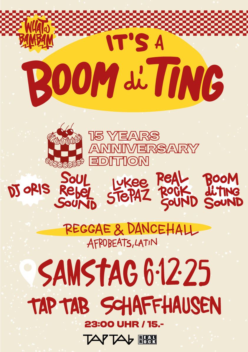 Boom Di Ting Sound sind bereits seit 2010 als Trio unterwegs. Die Crew aus Schaffhausen feiert ihr 15-jähriges Bestehen und macht dies bei uns im Tap Tab, bei der ebenfalls legendären Reihe “What A Bam Bam”. Die Geburtstags-Gast-DJ’s reisen aus der ganzen Schweiz an und spielen Reggae & Dancehall und Artverwandtes. Mit DJ Oris besucht uns ein Member der umtriebigen Blood A Run Crew aus Zürich. Soul Rebel Sound aus Bern kennen wir als gern gesehene Gäste bei der WABB. Lukee Stepaz aus Zürich ist seines Zeichens der Backing-DJ von Stereo Luchs. Real Rock Sound sind die What A Bam Bam-Residents und Boom Di Ting Sound werden an ihrer Geburtstagssause auch die Regler bedienen. One more year pon dem!