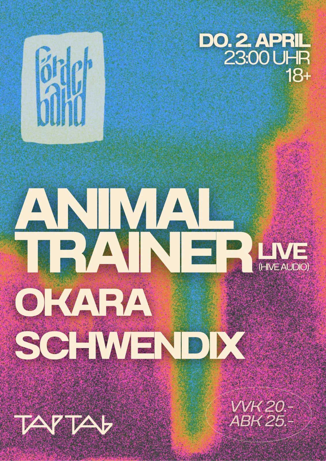 Erstmals in der Geschichte der FÖRDERBAND können wir einen Live Act verbuchen! ANIMAL TRAINER begeistert uns bei seinem nächsten Besuch LIVE und ist seit Jahren ein fester Bestandteil der elektronischen Musikszene aus Zürich. Mit ihrer eigenen Interpretation des «Slow Rave» haben sie eine musikalische Handschrift entwickelt, die weit über die Landesgrenzen hinaus Anklang findet. Ihre weltweite Party-Bewegung hat unzählige Liebhaber elektronischer Musik erreicht und ihre Vision zu tausenden, wenn nicht Millionen von Menschen getragen. Ihre Produktionen und DJ-Sets stehen für Tiefe, Groove und eine besondere Atmosphäre, die sich langsam aufbaut und das Publikum spürbar mitnimmt. Als Live-Performance entsteht daraus eine zusätzliche Dynamik, die man so nur direkt auf der Bühne erlebt – unmittelbarer, roher und noch näher an der Musik.