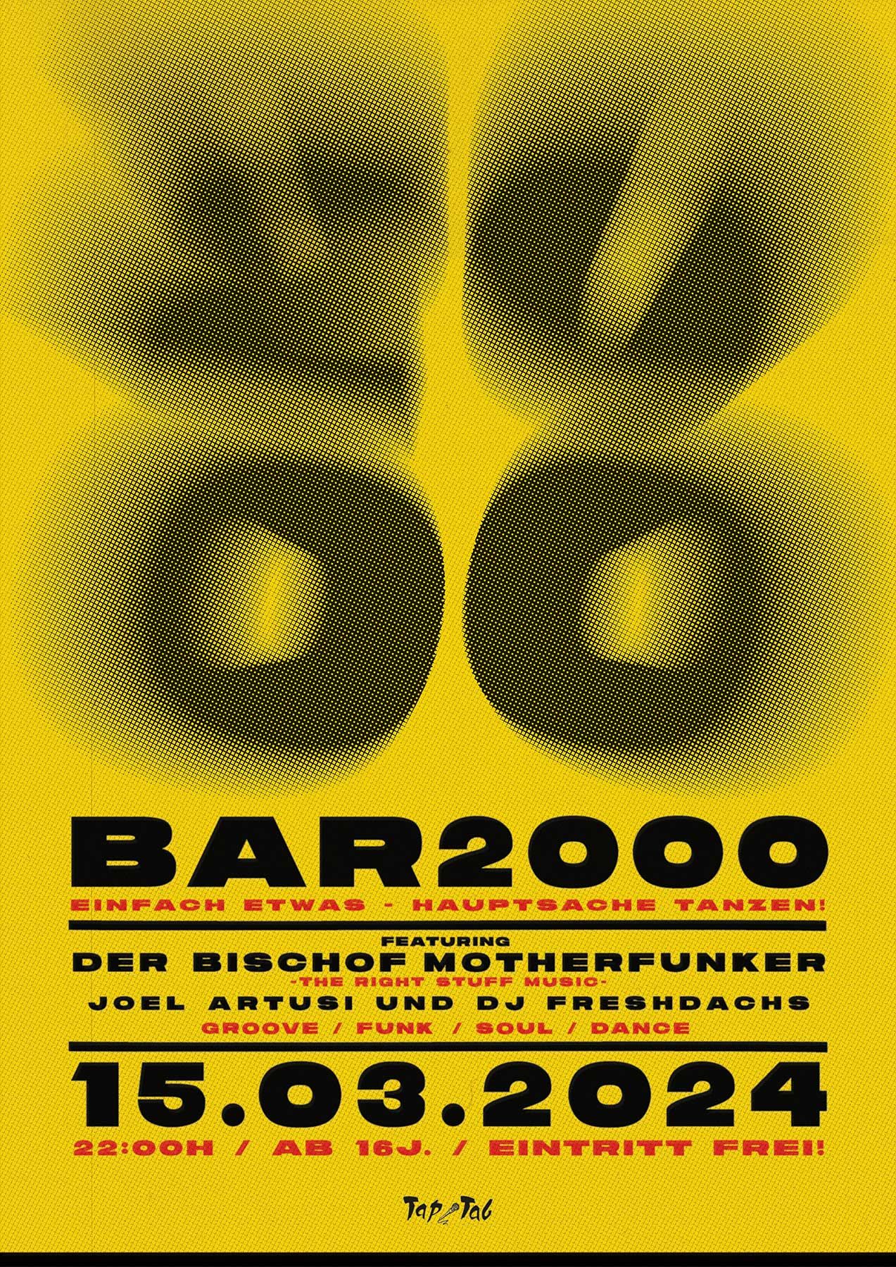 Wenn die DJs FRESHDACHS und JOEL ARTUSI für einen Abend die Plattenteller übernehmen und die BAR2000 mit ihrem einzigartigen Mix aus Funk, Soul und Discogrooves zum Beben bringen, dann gibt es an diesem Abend sicher kein Halten mehr! Wer anfangs noch gemütlch an der Theke am Eiswürfel nuckelt und versucht einen möglichst lässigen Eindruck zu hinterlassen, wird dem Druck der treibenden Beats wohl früher oder später nachgeben müssen und mit pulsierendem Herz der Tanzfläche Tribut zollen. Und wenn du glaubst es geht nicht mehr, dann kommt ein BISCHOF und der MOTHERFUNKER daher. Es wird immerzu nachgelegt und der Ofen bleibt am Glühen! Tauche ein in die Vibes der legendären BAR2000 (not 2000er Hitparade!) und lass dich entspannt und unverhofft verführen in eine wilde schweisstreibende Nacht!