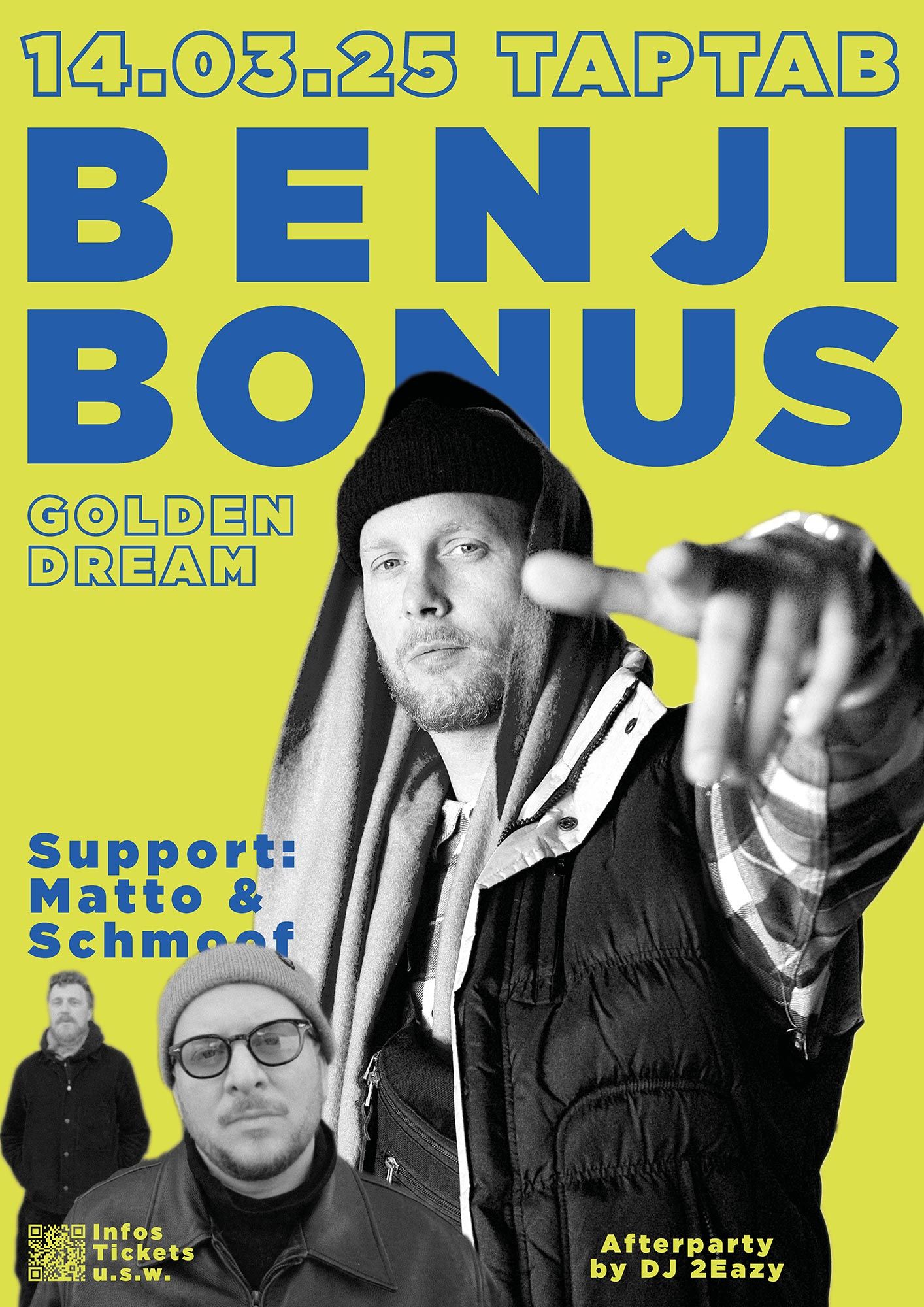 Spätestens seit dem SRF Virus Bounce Cypher22 ist klar, BENJI BONUS ist einer der authentischsten Rapper der Schweiz. Der Badener ist für seine spontane Art bekannt, mit welcher er seine Auftritte einzigartig macht. Mit „Golden Dream“ releast der Badener Rapper sein zweites Solo-Album. Geprägt von seinen einzigartigen Cypher-Performances überzeugt BENJI BONUS mit einem „straight-Rap-Album“, das mit exquisiten Beats und deepen Lyrics seinesgleichen sucht.