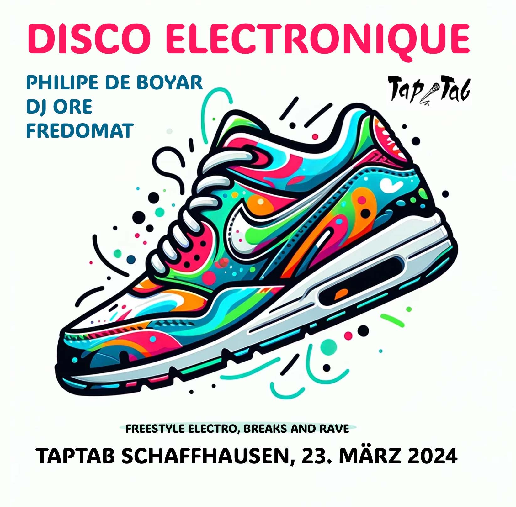 Bringt eure Körper in Stellung, Füsse aufs Parkett und die Hände in die Luft - alle Grufties aus den Kammern! Nach einer atemberaubenden Reise von 2006 bis 2011 kehrt sie triumphierend zurück. Die legendäre DISCO ELECTRONIQUE ist wieder da! Natürlich mit PHILIPE DE BOYAR an den Decks. Mach dich bereit für eine Nacht voller bassgesteuerter, pumpend-rockender Electrostomper. DJ ORE und FREDOMAT machen den Support. Schnür die Tanzschuhe. Stimmung auf Maximum. Energie auf Vollgas. Wir raven und lassen die Morgenstunden um Gnade bitten. Heisser Scheiss auf Eis – we’re back und zwar sowas von.