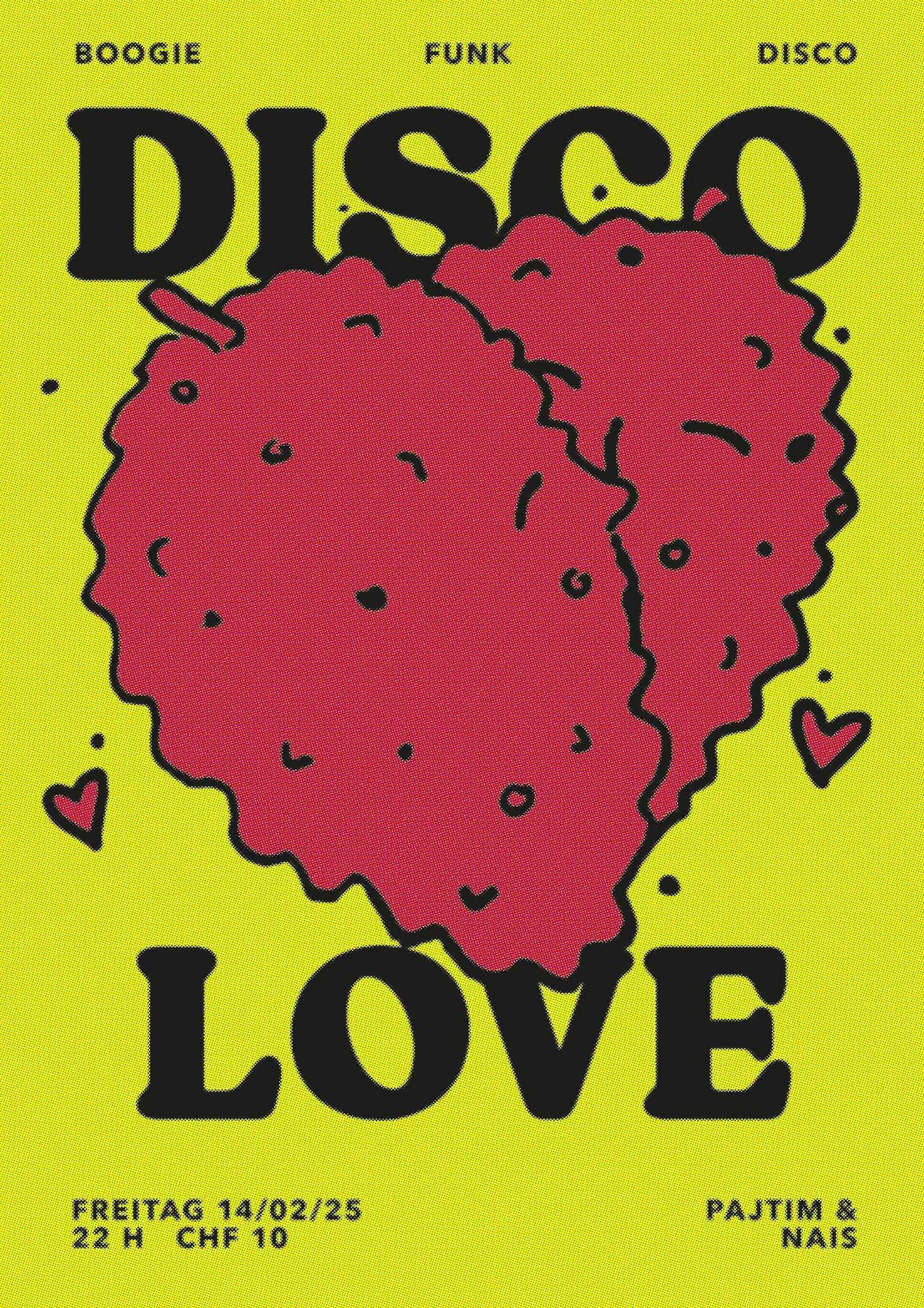 Immer wenn es knistert und knackt in den Boxen sind wir uns einig - es ist DISCO LOVE! Und der Zufall könnte nicht besser gefallen sein, wir haben hier die passende Party, welche euch zum Valentinstag in Stimmung bringt! Eine musikalische Zeitreise von den funky 70ern bis zu den raren Grooves von heute! PAJTIM und NAIS werden die Plattenteller zum Glühen bringen und euch die besten Disco- und Funk-Hits um die Ohren hauen. Von „Stayin' Alive“ bis „Uptown Funk“ – wir haben alles, was euer Herz begehrt! Kommt vorbei und bringt eure besten Moves mit viel Liebe auf die Tanzfläche! Und keine Sorge, wenn ihr keinen Partner habt – hier ist niemand allein und mit etwas Glück, findet ihr vielleicht euren nächsten Disco-Partner in Crime! Wer weiss, vielleicht wird aus einem „One Night Stand“ ein „Forever Dance Partner“! Also schnappt euch euer glitzerndes Outfit, eure besten Freunde oder euer Date und macht euch bereit für eine Nacht voller Liebe & Tanzen auf funkigsten Beats der Stadt! Hate Hate - Love Love. Disco Love!