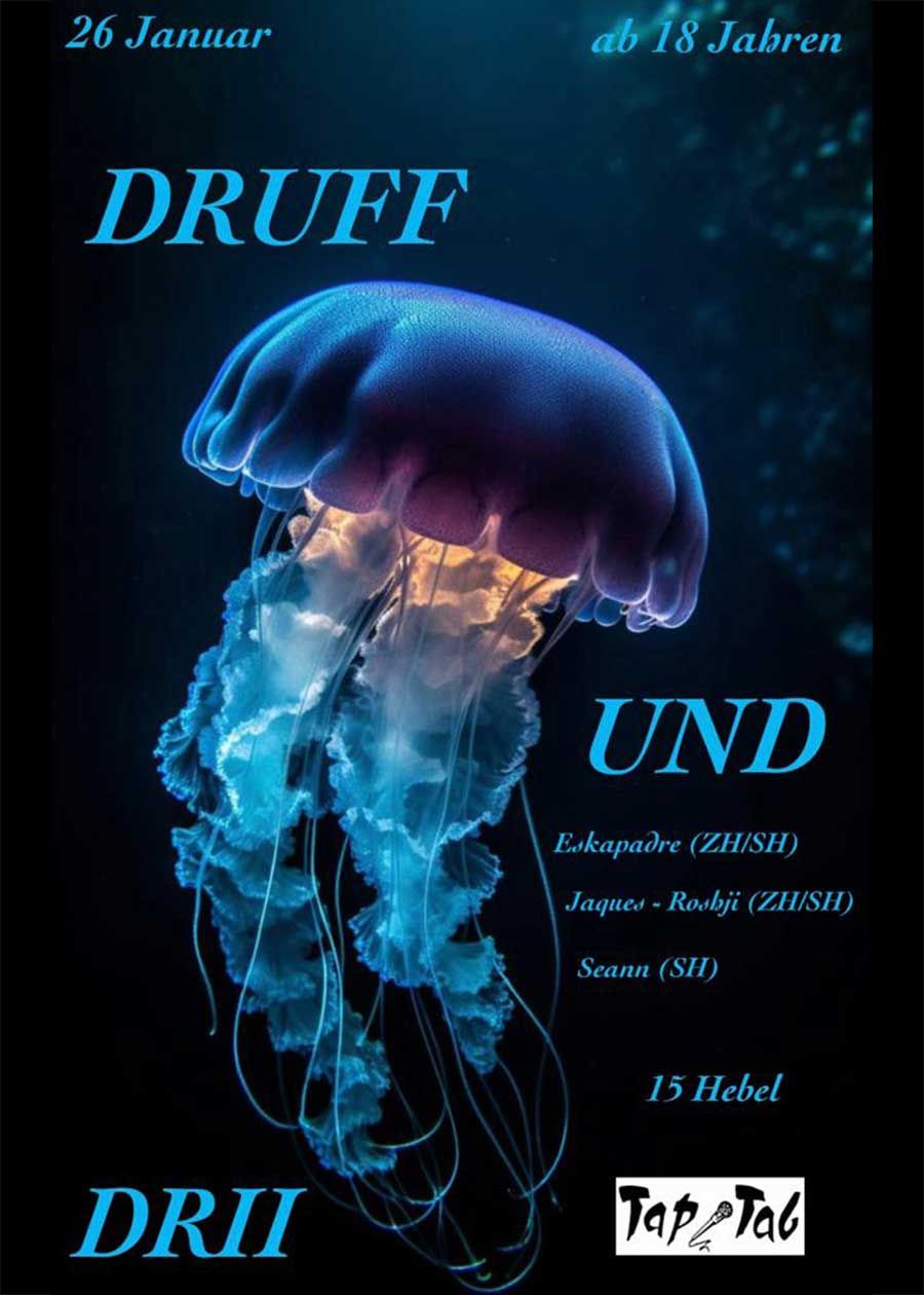 Druff&Drii ist das Mantra des tanzfreudigen Kollektivs aus unserer Nordstadt. Das junge schaffhauser Kollektiv lädt das erste Mal zum Tanz im öffentlichen Raum ein. Die Bässe sind tief und die Melodien berauschend, sodass sie euch auf eine Klangreise mitnehmen, die sich gewaschen hat. Der Abend beginnt bassgetränkt mit ESKAPADRE (Basshouse), im Zwischenspiel heizen b2b ROSHJI & JAQUES (House, Techhouse) ein und enden wird das Ganze scheppernd und schnell mit SEAN (Techno). Genauso wie ein Freitagabend verlaufen sollte: Gemeinsam statt einsam.