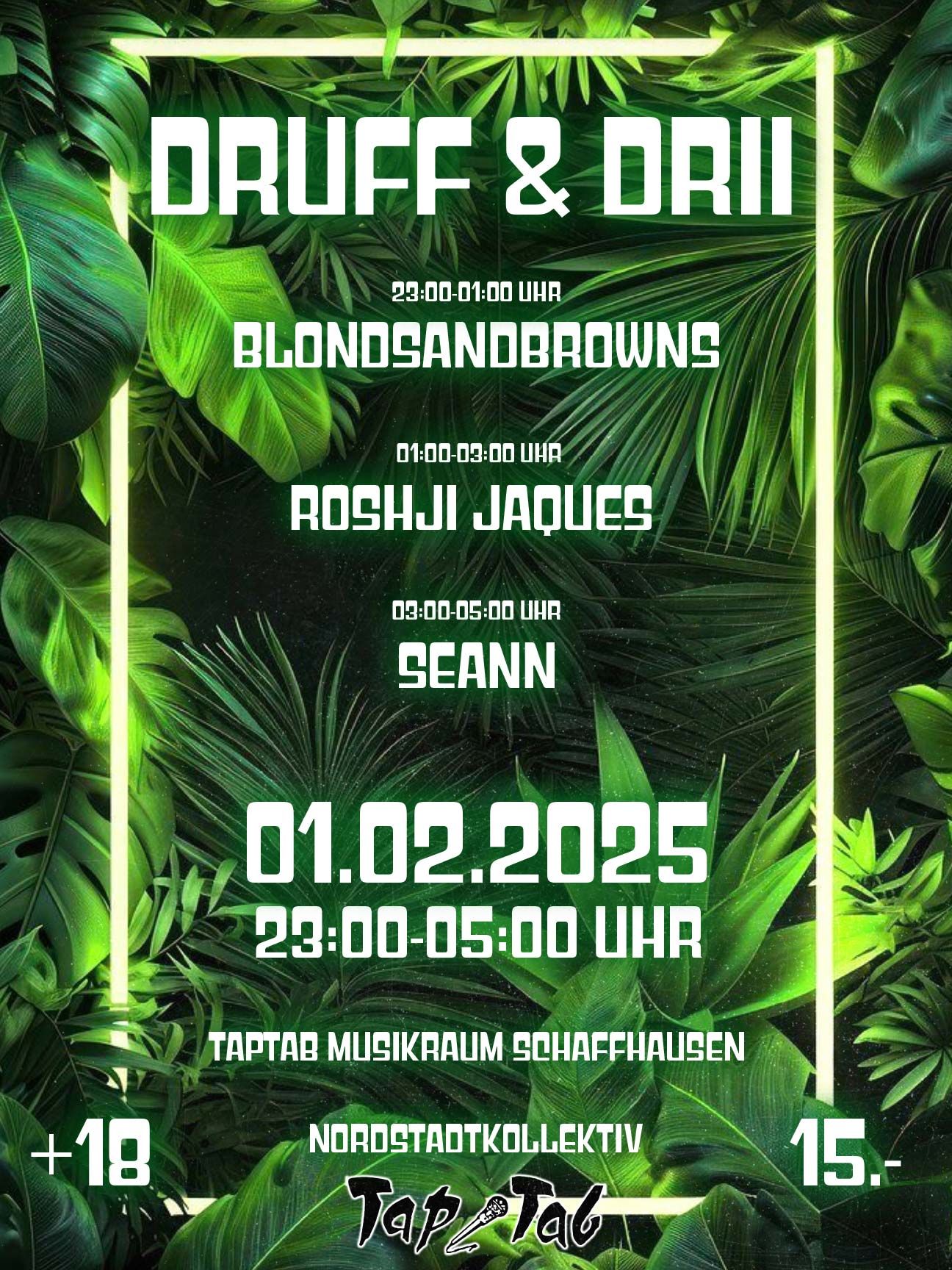 Du magst dich erinnern? Das Jahr 2024 war noch Jung und das tanzfreudige Kollektiv aus unserer Nordstadt rief zum ersten Mal ihr Mantra «DRUFF&DRII» aus. Das junge Schaffhauser Kollektiv lud zum Tanz im öffentlichen Raum und hinterliess in euren Köpfen einen bleibenden Eindruck. Bei Ausgabe 2 & 3 hat sich die Schose wiederholt, euer Verlangen scheint allerdings noch immer gross und ungestillt. Drum gibts auch in 2025 viel Geballer zum Absteppen. Frei nach dem Motto «gemeinsam statt einsam» könnt ihr euch abermals zusammenfinden und vom Bassgewitter durchkneten lassen bis euch die Zündspule aussetzt. Das «Grüetzi!» gebt ihr an diesem Abend an das Junge female Newcomer DJ-Duo BLONDESANDBROWNS welche zum ersten Mal das TapTab begeistern werden. Eingerahmt wird deren Set von ROSHJI & JAQUES welche euch in eine selten gesehene Welt technoider Melodien und Drums mitnehmen. Inspiriert von DJ-Grössen wie Charlotte de Witte, bringen die beiden den Kessel mit House & Techhouse zum Kochen. Ausserdem wird SEANN wie gewohnt schnell, schonungslos, schweiss getränkt seinen Sound servieren, welcher dich vielleicht an Iri, Monolink oder Stan Christ erinnert. Kurz und knapp: Es scheppert mal wieder in der Kiste!