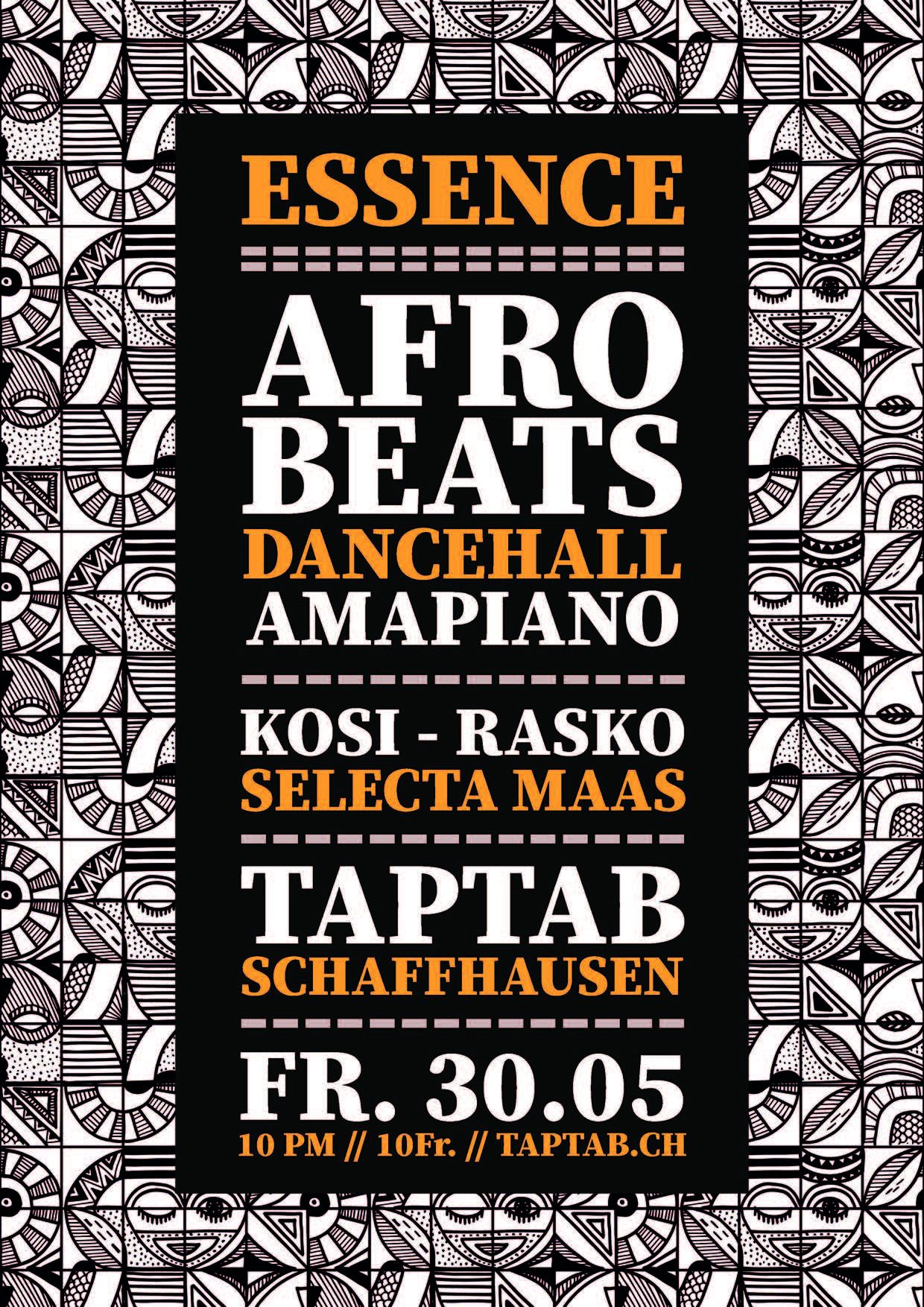ESSENCE ist die Quintessenz aus Afrobeats, Amapiano und Dancehall gefiltert von den besten DJs aus der Region. Mit KOSI, RASKO & SELECTA MAAS bespielen euch alten Hasen und absolute Kenner ihres Fachs. Sie sind nicht weniger brüchtigt als das TapTab selbst, liefern es süss, heiss und fettig wie Churros. TYLA, BURNA BOY, WIZKID, REMA, ASAKE, JAYO oder NICKI MINAJ. Du weisst wie es mit dem TURNUP läuft, oder?