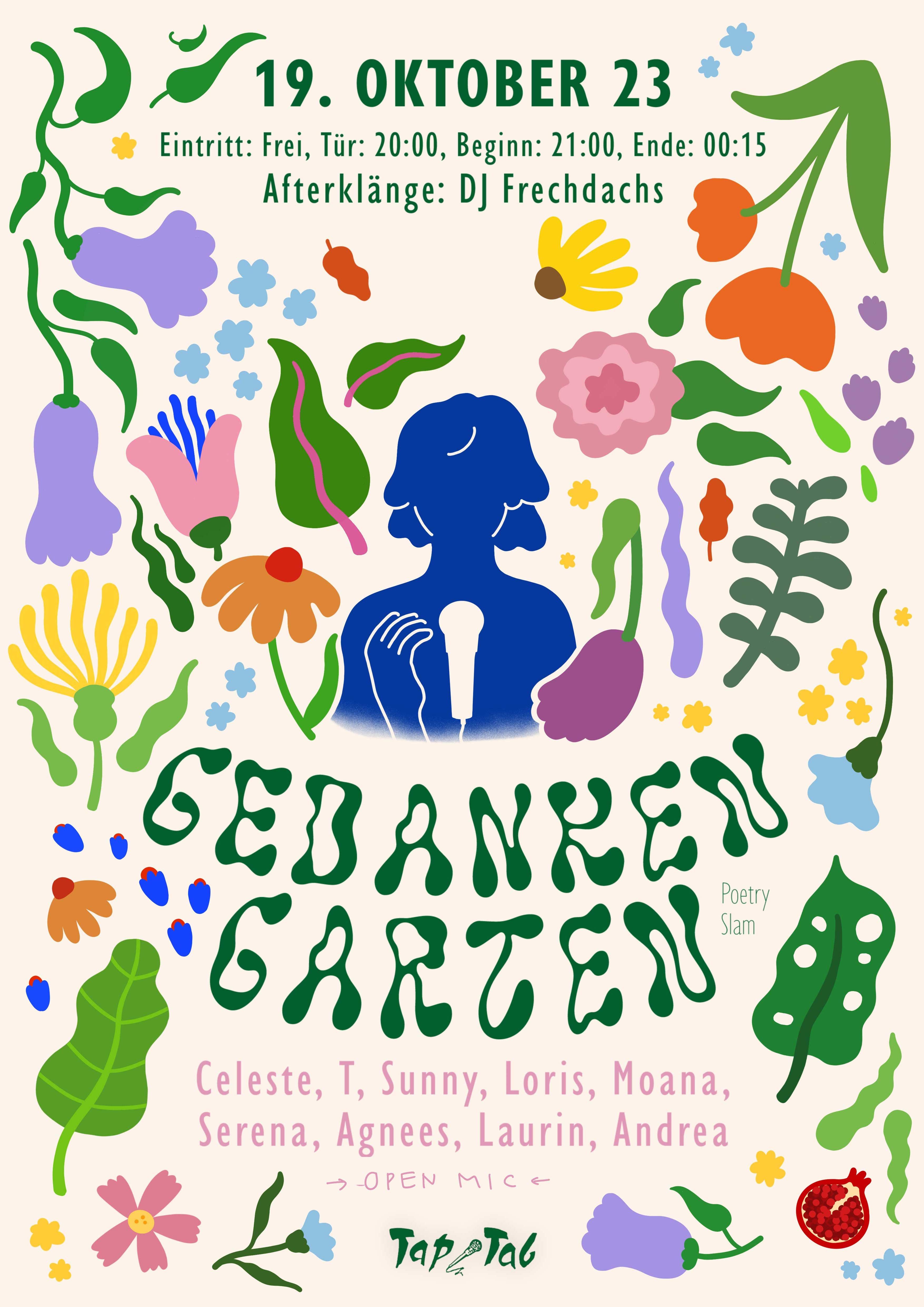 Das TapTab verwandelt sich in einen «dichten», wilden Garten, in welchem Philosoph- und Poet*innen ihren Gedanken freien Lauf lassen und diese mit der Welt teilen können. Hier geht es keineswegs um einen Wettstreit, viel mehr und vor allem um den Austausch, Erfahrungen zu sammeln und letztlich - schlicht und ergreifend - um die Liebe zur Lyrik. In entspannter Atmosphäre können Gedanken sprudeln, egal ob gereimt, gedichtet, geflüstert, auf Deutsch oder im besten Fall in einer ganz eigensinnigen Sprache. Von melancholisch, nachdenklich bis chrarmant-witzig zu urkomisch. Nahezu alles ist erlaubt und kann vorgetragen werden.