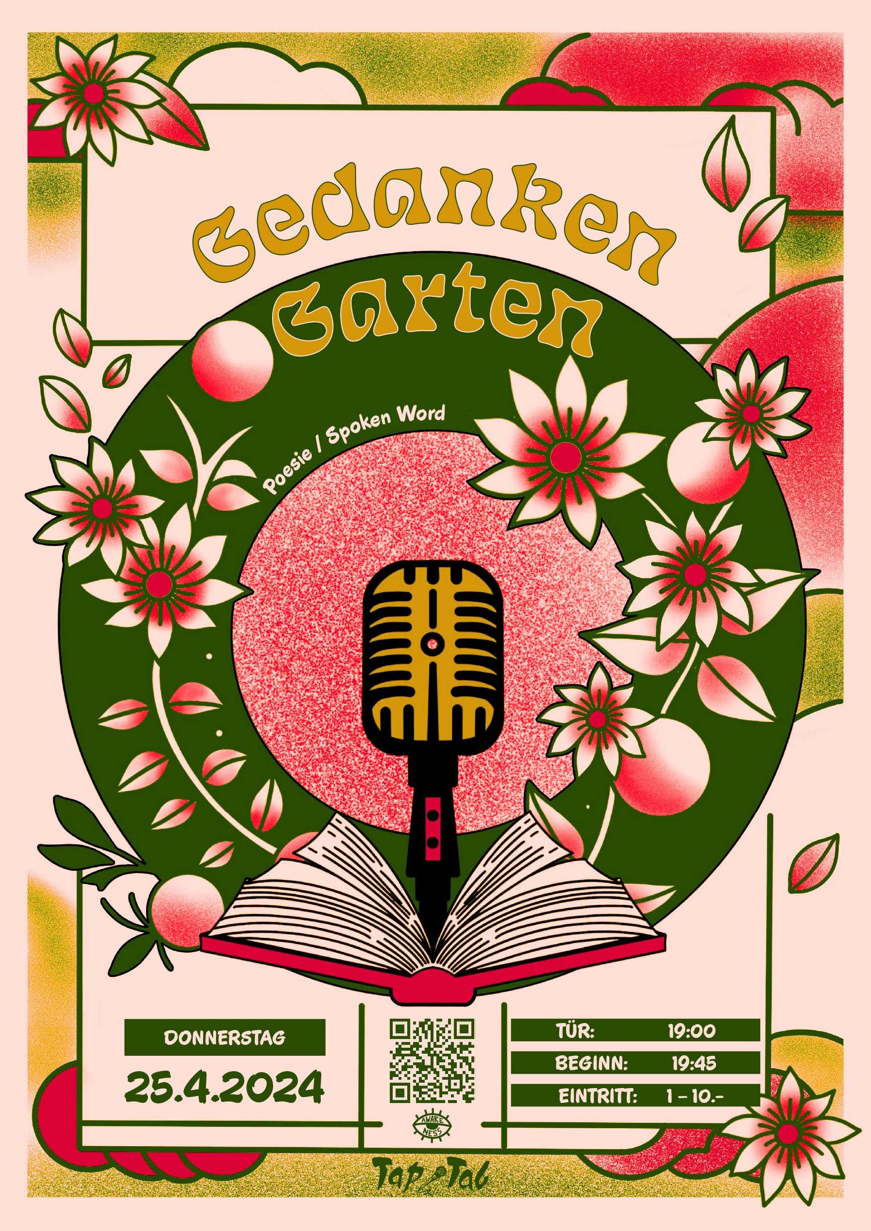 Die Pforten des TapTab öffnen sich zu einem verträumten Garten, in dem Gedanken wie Schmetterlinge durch die Luft tanzen. hier wird der Raum in einen frühlingshaften Dichter-Dschungel verwandelt! Zwischen blühenden Metaphern und duftenden Versen werden die Gäste auf eine Reise durch die Vielfalt der Sprache mitgenommen.Schnapp dir eine Portion Inspiration und lass dich von der fröhlichen Frühlingsatmosphäre mitreißen. Dieser Abend verspricht nicht nur Worte, sondern auch jede Menge gute Laune.