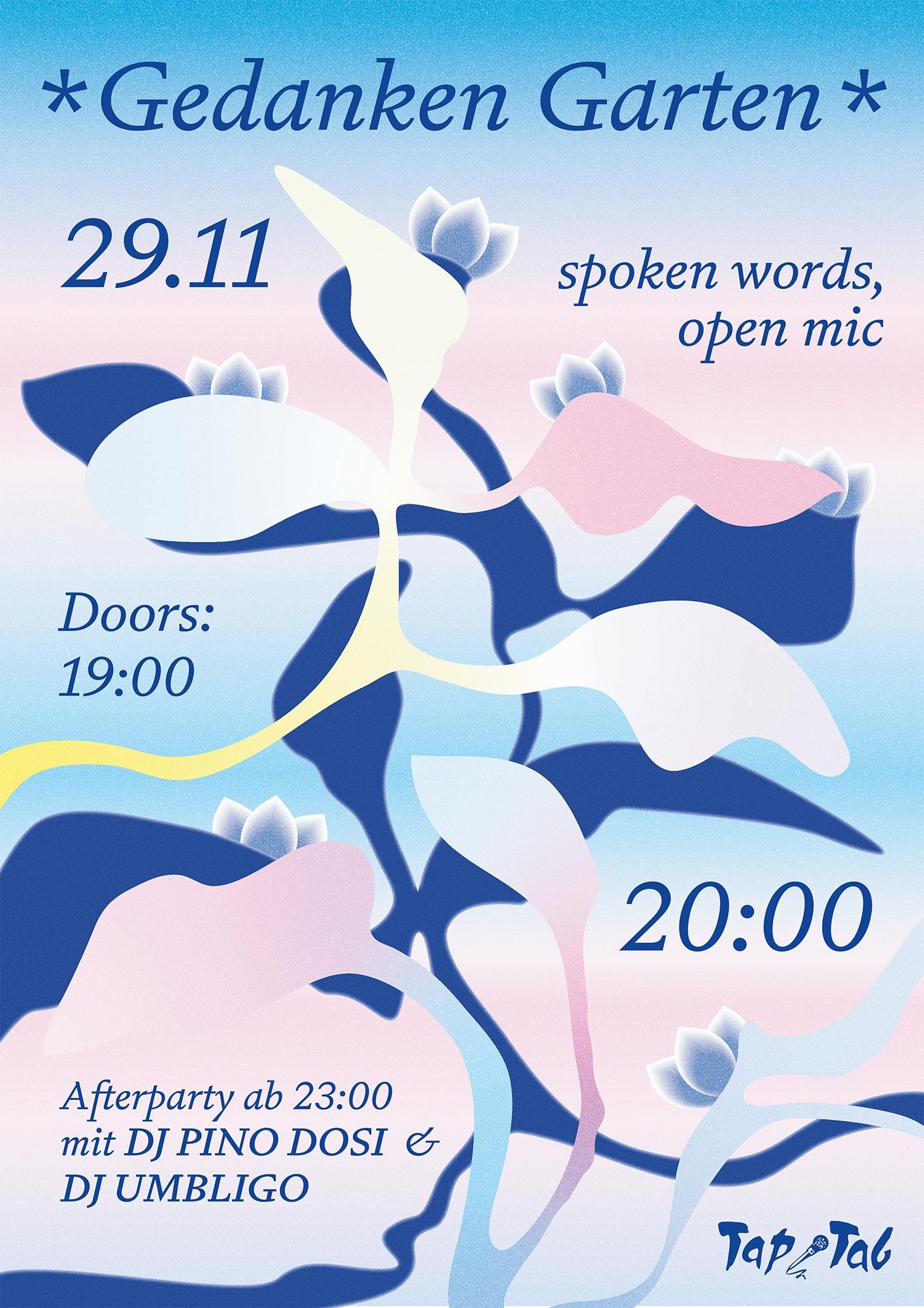 Nach der grossen Sommertournee durch Strandbadis und Hinterhöfe ist der GEDANKEN GARTEN endlich wieder zuhause und es öffnen sich abermals die Pforten zu einem verträumten Garten, in dem Gedanken wie Kolibris durch die Lüfte flattern! Wir freuen uns sehr auf einen weiteren bunten Abend voller verträumter Poesie und aufregend vorgertragenen Texten. Auch in dieser Ausgabe verwandelt sich das TapTab in einen bunten Garten und in eine Oase der Dichtkunst. Wirklich ALLE sind willkommen, dürfen ihren Mut zusammen nehmen und beim Open Mic ihre eigenen Gedichte vortragen. Dabei sind der Kreativität keine Grenzen gesetzt und die Teilnehmer*innen werden angeregt lyrisch zu wuchern wie Ihnen der Kopf wächst. Dieser Abend verspricht nicht nur Worte, sondern auch jede Menge gute Laune.