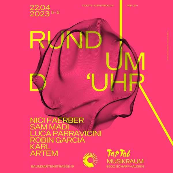 Alle guten Dinge sind drei, deshalb wird am Samstag, 22. April 2023 im Musikraum Tap Tab, an der Baumgartenstrasse 19 in Schaffhausen, bereits zum dritten Mal, von fünf bis fünf, oder halt eben; Rund um d`Uhr getanzt. Die wachsende House und Techno-Kultur gewinnt kumulativ an Beliebtheit und lädt somit, nicht erst ab Mitternacht, sondern bereits ab 17:00 Uhr zum Tanz ein. Alerte Dj-Sets gibt es diesmal von den Künstlern; Nici Faerber aus dem Klaus Club in Zürich, den beiden Geschwistern Artem, ebenfalls aus Zürich, sowie den Hausgenossen; Sam Madi, Luca Parravicini, Robin Garcia und Karl.