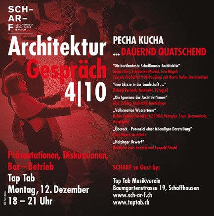 Das Schaffhauser Architektur Forum veranstaltet im TapTab von September 2022 bis Juni 2023 eine monatliche Gesprächsreihe über Architektur, Städtebau und Baukultur. Beispiele aktueller, öffentlich interessanter Projekte werden im Dialog pointiert und transparent veranschaulicht und zeigen die Haltung und das Verständnis der eingeladenen Fachpersonen in Bezug zum vieldiskutierten Qualitätsbegriff. Zehn Life-Interview Abende – in lockerer Bar-Atmosphäre – zwischen Autoren*innen mit Schaffhauser Bezug und der SCHARF-Moderation als Vermittlerin bieten dem Publikum Einsichten hinter die Planungsprozesse.
