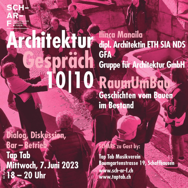Das Schaffhauser Architektur Forum veranstaltet von September 2022 bis Juni 2023 eine monatliche Gesprächsreihe über Architektur, Städtebau und Baukultur im TapTab. Beispiele aktueller, öffentlich interessanter Projekte werden im Dialog pointiert und transparent veranschaulicht und zeigen die Haltung und das Verständnis der eingeladenen Fachpersonen in Bezug zum vieldiskutierten Qualitätsbegriff.