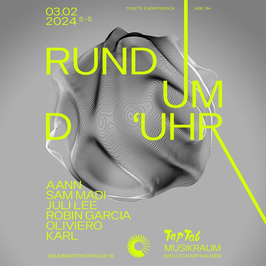 Die Zentrifuge der frenetisch wachsenden Techno-Kultur ist der 12h-Rave der Event Reihe Rund um d`Uhr im Tap Tab in Schaffhausen. Bereits etliche Individuen dieser Kultur beschallten die beeindruckende Lokalität. Mit der talentierten DJane AANN steht am Samstag, 03. Februar 2024, eine weitere Krone der Schöpfung auf der Bühne. Ihre Musik überschreitet traditionelle Grenzen und umfasst Genres von tiefem und melodischem House bis hin zum Techno. Mit Veröffentlichungen auf Ritter Butzke und Heinz Music, sowie Stage-Sharing mit Künstlern wie Carl Cox, Amelie Lens, Solomun, Giorgia Angiuli, Fritz Kalkbrenner und vielen anderen, hat sie sich als herausragende Künstlerin in der Welt der elektronischen Musik gefestigt. Das Äquinoktium an ihrer Seite ist die talentierte DJane Juli Lee aus Zürich. Viril abgerundet wird das feminin ausgewogene DJ-Line Up mit lokalen Grössen wie dem sympathieträger Sam Madi, sowie Label Resident Robin Garcia, Oliviero und Karl. Ab 17:00 Uhr öffnet die Galerie vom Tap Tab zum Nachmittagstanz und ab 23:00 Uhr verlagert sich der Tanz auf den Main-Floor.