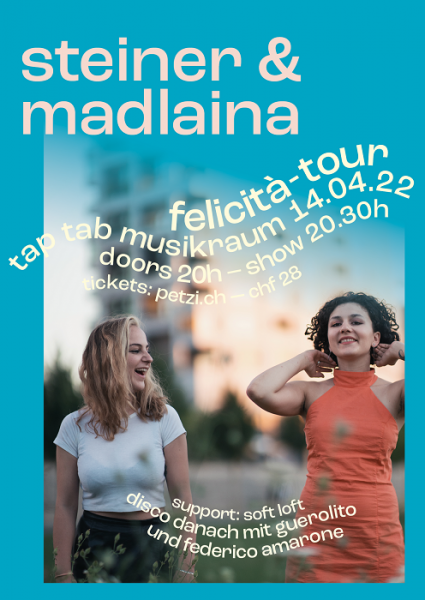 Steiner & Madlaina (CH), Support: Soft Loft (CH), Afterparty: Disco Disco Disco mit den DJs Guerolito (LU) und Federico Amarone (SH)