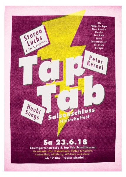 Zweite Runde: die dicke TapTab-Saisonschlussparty in unserm Baumgartenstrassen-Backyard. Massiv! Stereo Luchs setzt die Bühne in Brand, die fabulösen Peter Kernel und Haubi Songs machen: keine halben Sachen.