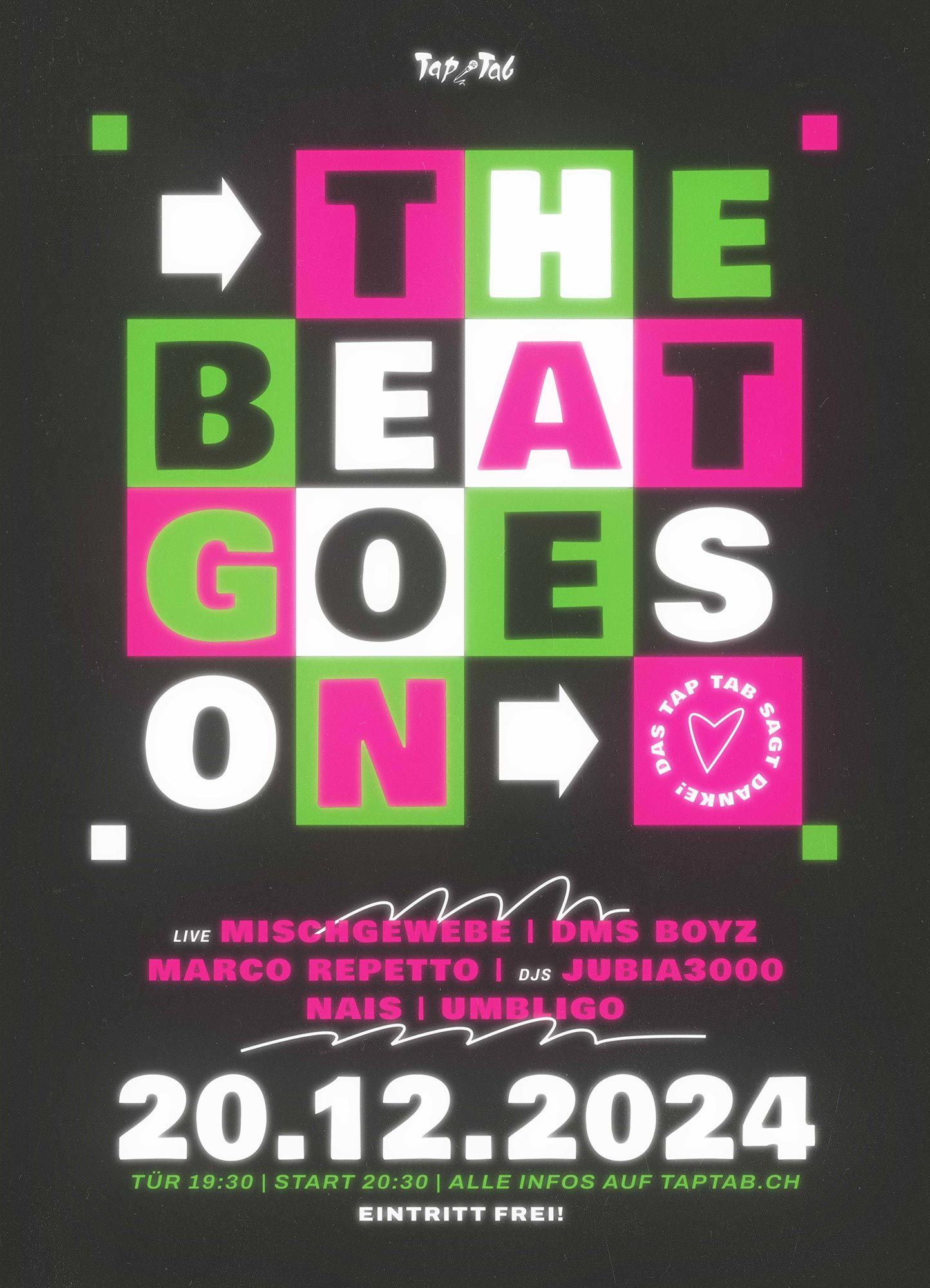 Wir sagen DANKE! Wir haben die tollste und schönste Community und wissen das zu schätzen! Nach dem überwältigenden und überragenden Support bei unserem Crowdfunding in der diesjährigen Sommerpause ist es an der Zeit etwas zurück zu geben. Daher haben wir für unsere Stammgäste, Mitglieder*innen & Supporter*innen (und solche die es werden wollen...) einen Dankes-Event auf die Beine gestellt, bei welchem es richtig zur Sache geht! 3 Live-Bands, 3 DJs & einige Specials warten auf euch! THE BEAT GOES ON, cause there is no last dance! Lasst uns alle zusammen feiern, tanzen, auf dass wir es mal wieder gemeinsam gestämmt haben und anstossen auf eine hoffentlich goldene Zukunft für viele weitere TapTab-Generationen. Ein Abend voller unvergesslicher Momente und die Chance auf ein gemütliches und bereicherndes Miteinander!