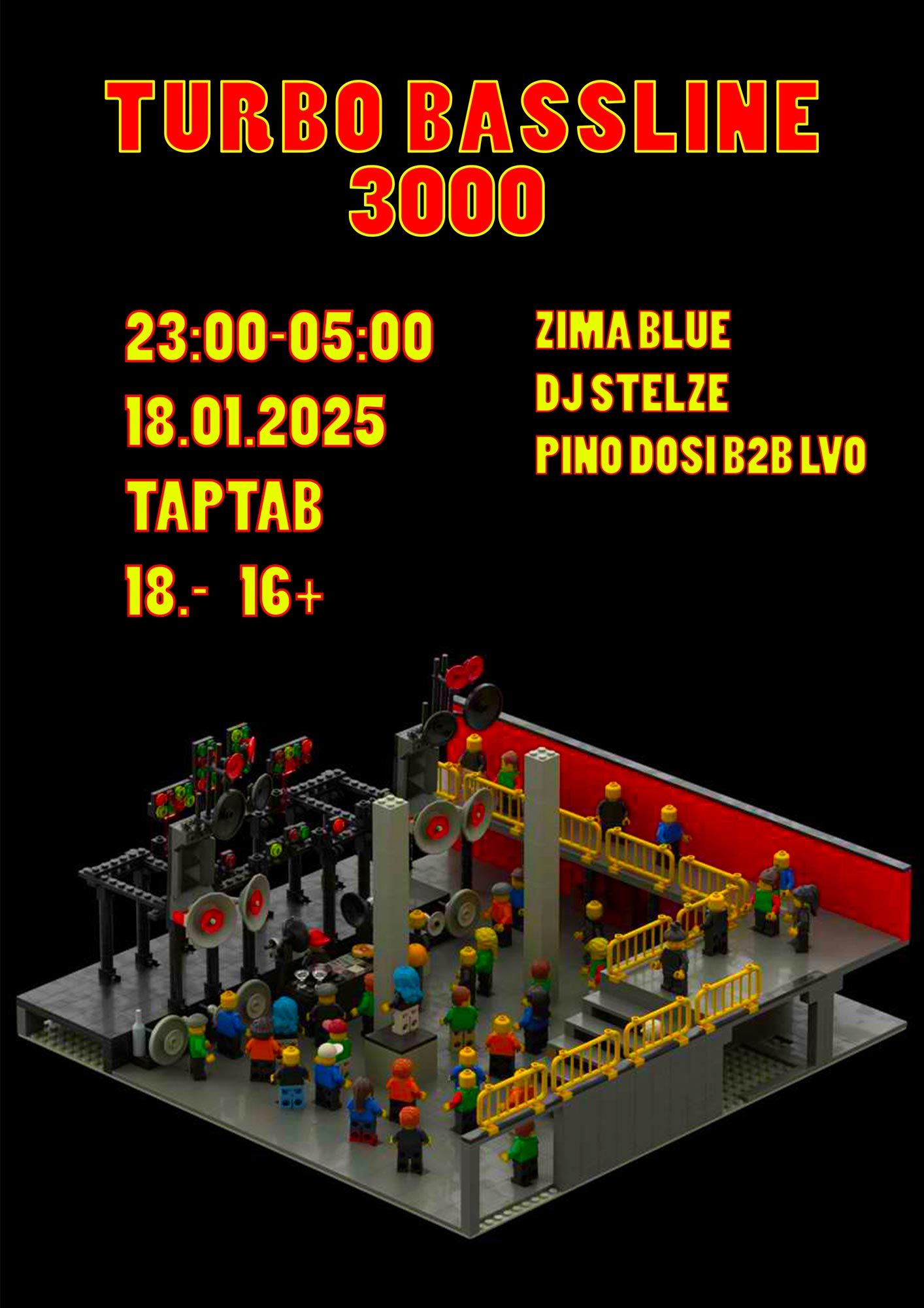 Neues Jahr - neues Format! TURBO BASSLINE 3000 klingt wie eine Fusion aus Drumcomputer und Zeitmaschine, welche euch krächzend und knarzend, Öl spuckend und unter Funkenschlag in andere Sphären katapultiert. Ehrlich gesagt ist es das auch! Bei TURBO BASSLINE 3000 dreht sich alles um UK Garage, Jungle und Raritäten aus der Drum'n'Bass-Ecke. Fett! Die Produktionen sprühen nur so vor roher Energie und die «Ruffness» im Mix mit den unwiderstehlichen Grooves schiebt euer Steißbein rhytmisch durch den Club. Mit DJ STELZE aus Offenbach (liebe Grüße an Hafti Abi), konnten wir zum Auftakt direkt einen Connoisseur und Visionär der Szene verpflichten. Bereits im zarten Alter von 17 Jahren begann der Musikjunkie aufzulegen, krallte sich irgendwann dann einen Resident-Slot im renomierten SILBERGOLD CLUB im nahegelegenen Frankfurt und wurde Mitglied des Kollektivs INTENSE BASS BOX, mit welchem er die Szene nachhaltig basslastig prägen sollte. Auch mit von der Party, nicht weniger begabt und uns keine gänzlich Unbekannte im Periodensystem - ZIMA BLUE aus Züri! Meist unterwegs im Trio gibts Back-to-Back-to-Back und reichlich Neuverknüpfen unbekannter Synapsen im Oberstübchen. Speed House meets UK Garage, meets Techno - hallo Little Britain und täglich grüsst der Muskelkater unterm Stern ZIMA RECORDS. Also besser schön vorwärmen und von unseren Hosts PINO DOSI & LVO b2b physiotherapeutisch durchkneten lassen. Eine schnelle Nummer jagt die andere an diesem historischen Abend und wir sind gespannt, wer hier den Kolt am schnellsten zieht. Also holt eure Gunfingers raus und macht euch parat für die wildeste Prämiere von TURBO BASSLINE 3000!