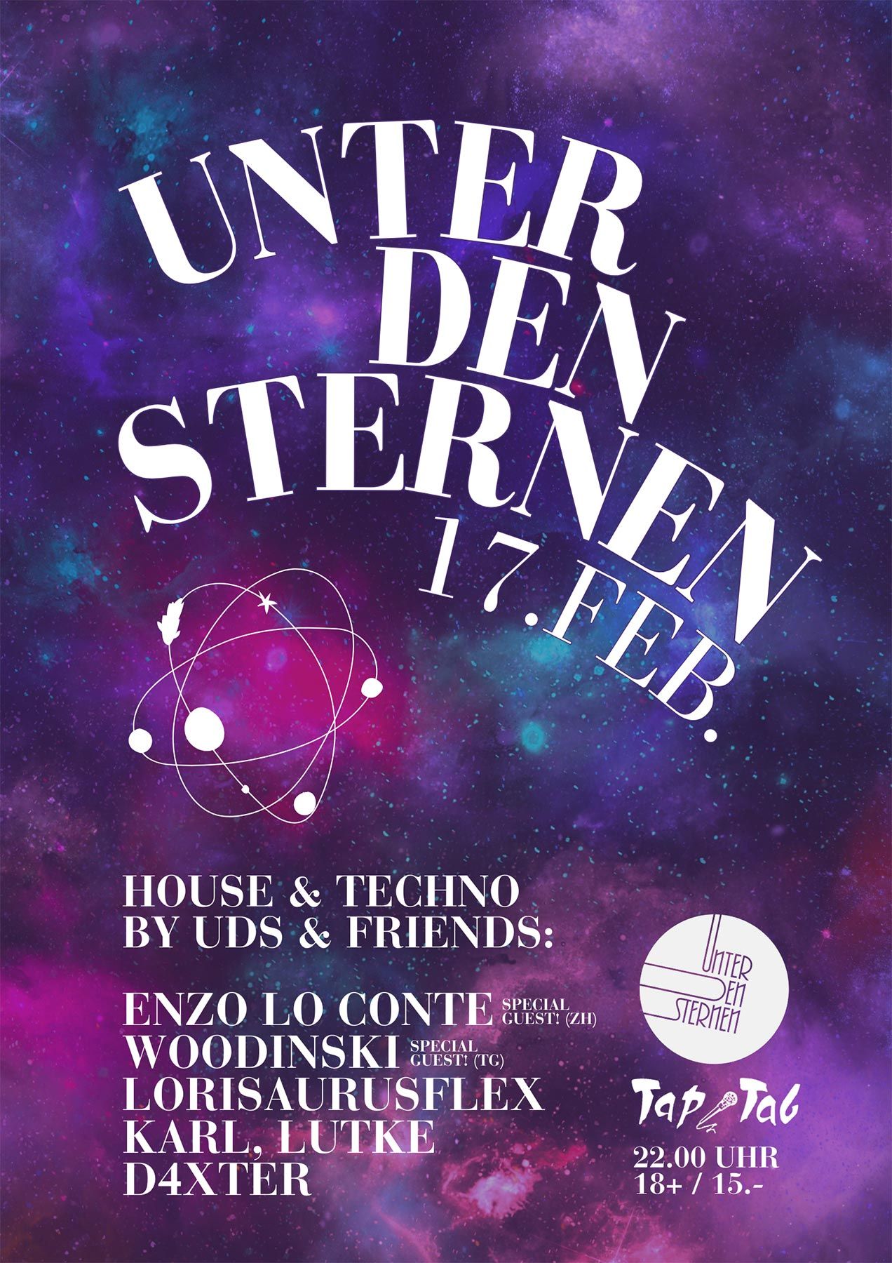 Wenn die Soundanlage einen Abend lang mal wieder «udsudsuds» macht, wird es Zeit, dass du durch die Nacht tanzt bis der nächste Stern wieder scheint. Hier gibts House, Electronica, Melodic Techno oder whatever! Hauptsache immer schön «4 to the floor» mit amtlich Wumms! Die Amigos vom UNTER DEN STERNEN Kollektiv wissen genau wie’s geht & hauen dir ihre besten Wave-Dateien auf den Grill und um die Öhrchen. Bringst du noch ein paar gefüllte Pilze mit Frischkäse mit, ok? Raven wie im Freien, nur halt Drinnen!