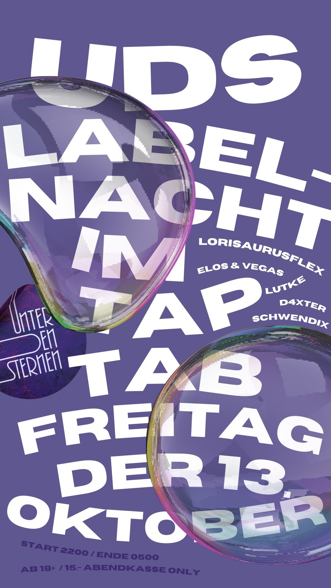 Amici, aufgepasst! Das berüchtigte Kollektiv „Unter den Sternen“ landet wieder mal im Tap Tab und versetzt die Tanzfläche in einen sphärischen Ritt durch Raum und Zeit. Also alle anschnallen und los geht die Reise auf die Ohren: Eine 4/4-Takt-Fahrt durch groovige Gebiete und melodische Hörwürdigkeiten. Und auch auf die Augen gibt's ein flashiges, mindblowing Deko-Spektakel. Kritiker würden sagen: Isch schono geil!Hinter der musikalischen Schaltzentrale an diesem Abend: Deep House-Commander "Schwendix", Professor der Houseologie "Lutke", ein Lama namens "Kaaaarl", "Elos", der Mann ohne Sorgen. Sein ehemaliger WG-Buddy "Vegas", sowie der tanzende Dino "Lorisaurusflex".