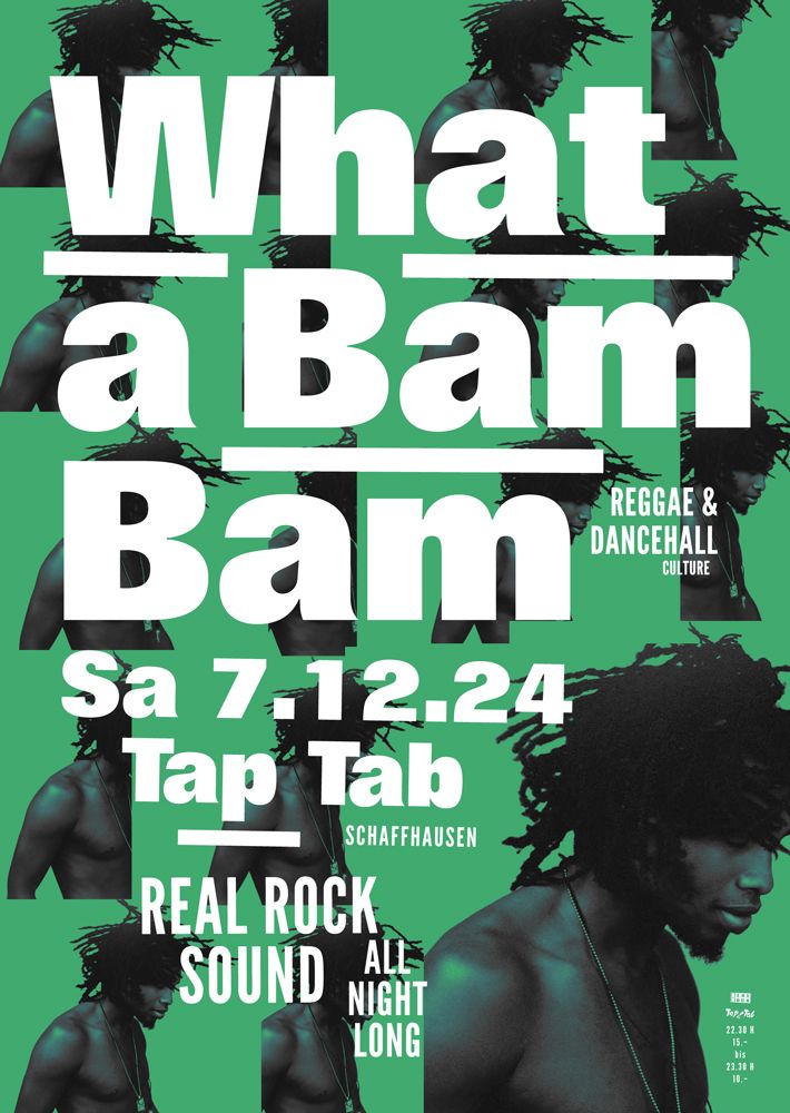 Endlich wieder Winter, endlich wieder dusse! Once again, die legendärste Reggae- und Dancehall Party in Schaffhausen gastiert im TapTab! REAL ROCK SOUND laden zum Dance, nicht nur auf der Empore, nein, im gesamten Club darf geschüttelt werden was der liebe Herrgott (oder wer auch immer) euch geschenkt hat. An der Kontrollstation SELECTA MAAS, SELECTA B-FLAT und allmighty SELECTA MISTA mit dem feinsten von Toots & The Maytals über Bob Marley, Marcia Griffiths, Culture, Barrington Levy, Shabba Ranks, Garnett Silk, Lady Saw, Beenie Man, Capleton, Beres Hammond, Alkaline, Vybz Kartel, Spice, Koffee, Chronixx, Aidonia, Konshens, Lila Iké bis zu Mortimer oder Valiant. Genug des Namedropping? «Come ina di dance», fühl die «Jamaican Vibes» und sei bereit für «More Fire»! It's WHAT A BAM BAM!