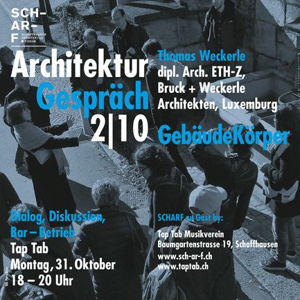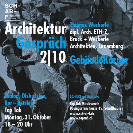 Das Schaffhauser Architektur Forum veranstaltet im TapTab von September 2022 bis Juni 2023 eine monatliche Gesprächsreihe über Architektur, Städtebau und Baukultur. Beispiele aktueller, öffentlich interessanter Projekte werden im Dialog pointiert und transparent veranschaulicht und zeigen die Haltung und das Verständnis der eingeladenen Fachpersonen in Bezug zum vieldiskutierten Qualitätsbegriff. Zehn Life-Interview Abende – in lockerer Bar-Atmosphäre – zwischen Autoren*innen mit Schaffhauser Bezug und der SCHARF-Moderation als Vermittlerin bieten dem Publikum Einsichten hinter die Planungsprozesse.